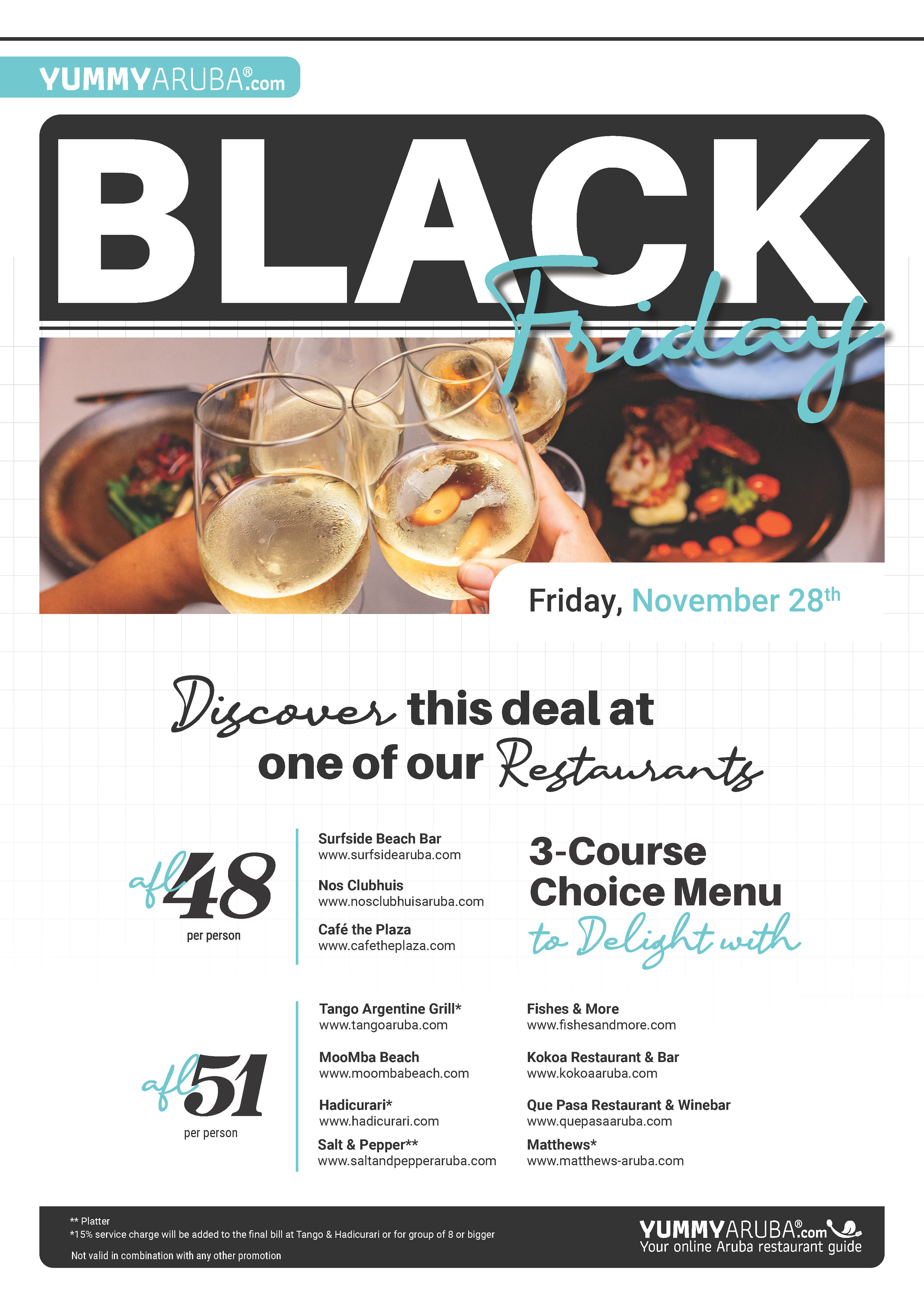 When the rush of Black Friday fades and shopping bags settle by the door, the evening invites something steadier, good company, thoughtful plates, and time to sit, breathe, and enjoy. Across our family of beachside, harbor-view, and plaza restaurants, chefs have shaped special menus priced at 48 or 51 Florins per person. Each one brings a sense of calm and a well-earned pause after a busy day.