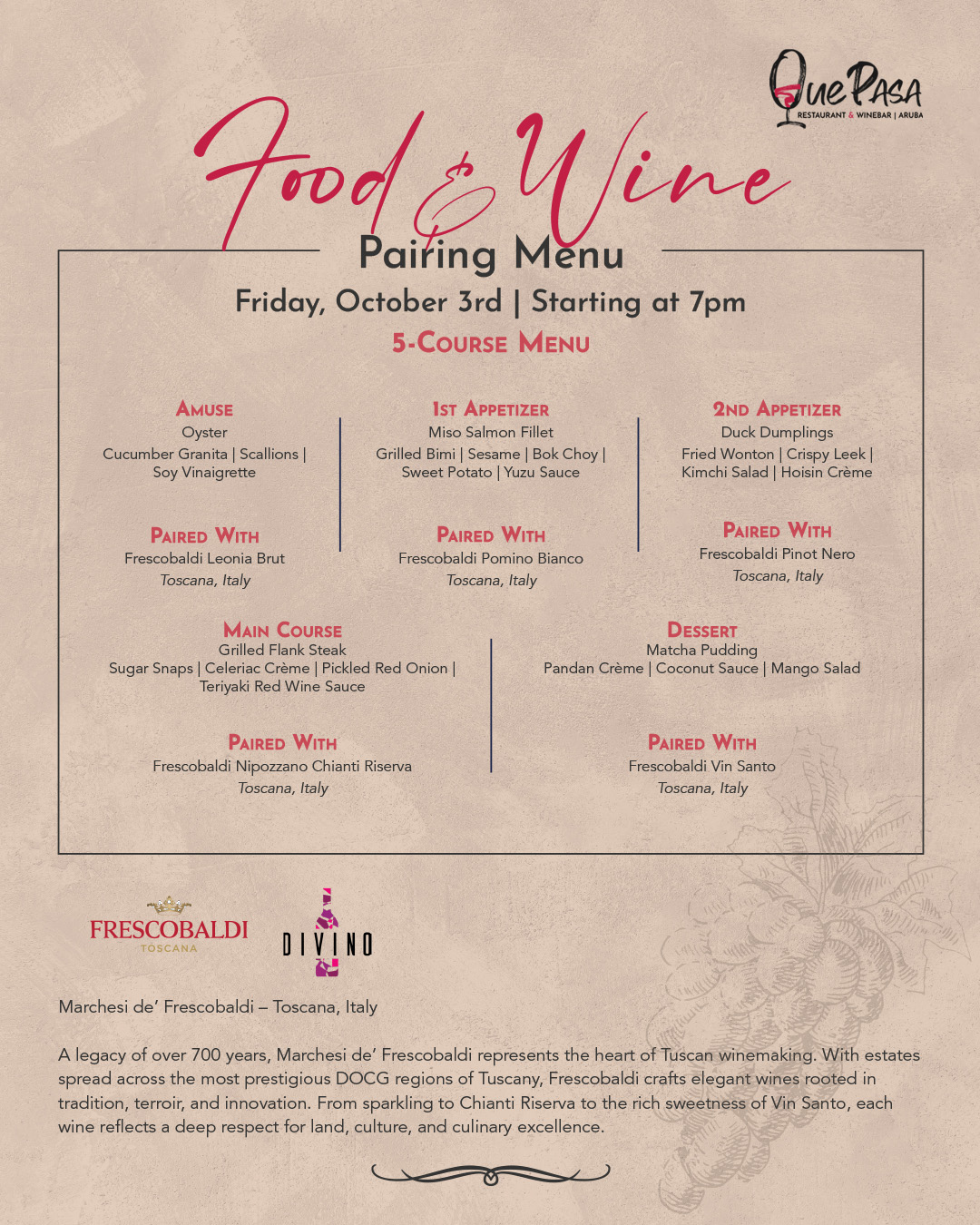 On the evening of Friday, October 3rd, Que Pasa will welcome guests for a Food & Wine Pairing Dinner starting at 7 PM. This one-night event brings together a 5-course menu designed by our Chef with wines from Frescobaldi by Divino, offering a journey through flavors and traditions for $99 per person.
