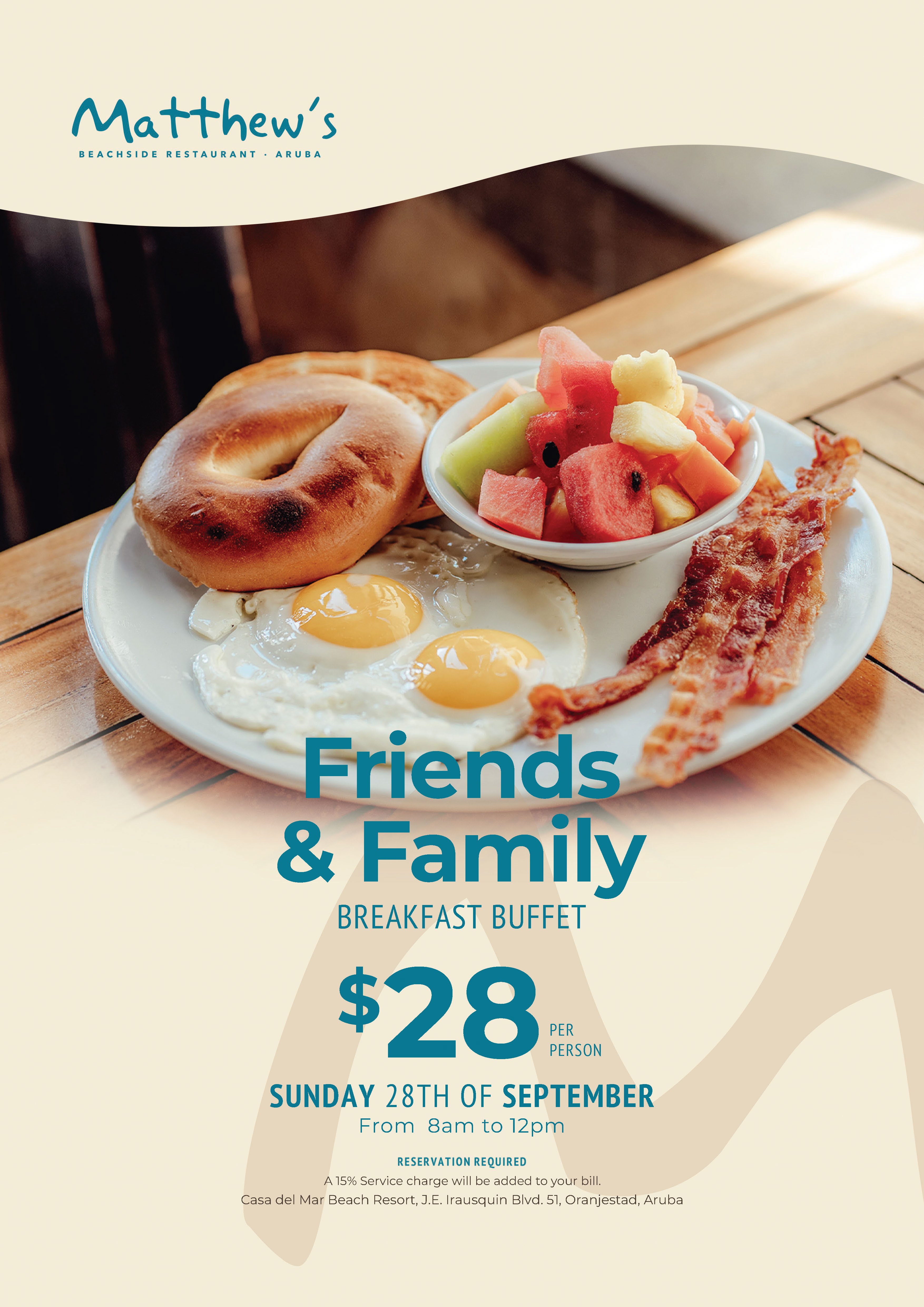 On Sunday, September 28th, Matthew’s invites you to a Friends and Family Breakfast Buffet from 8:00 AM to 12:00 PM. For just $28 per person, you’ll enjoy a plentiful breakfast spread in the relaxing setting of the oceanfront terrace, the perfect way to start your day.