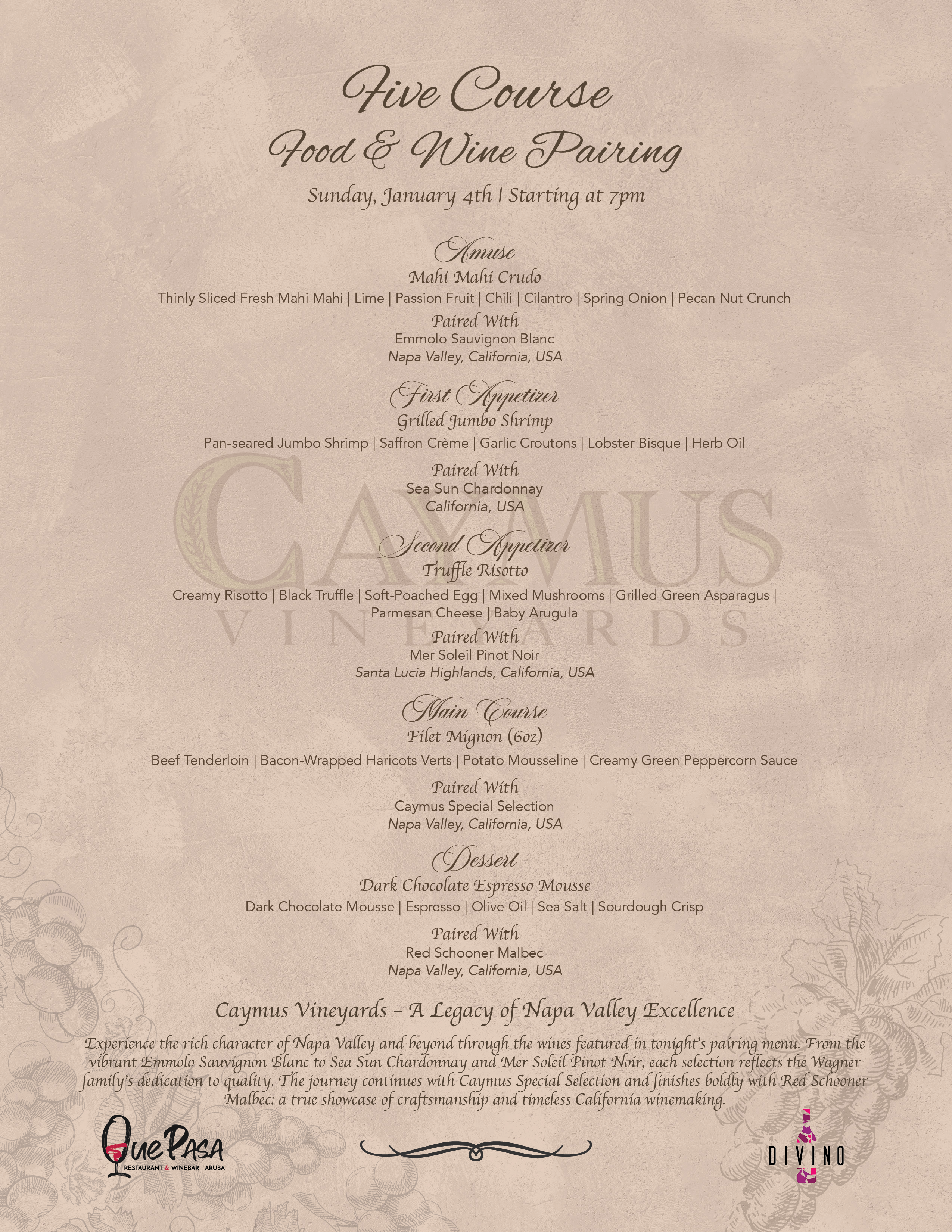 For this special night, the chef has created a multi-course menu, each dish paired with a wine chosen by the in-house sommelier. The evening’s pairings feature wines from Caymus Vineyards by Divino, proudly sponsored by Divino, bringing together refined flavors from Napa Valley and beyond.
