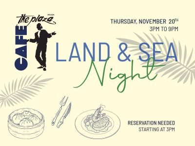 On Thursday, November 20th, Café the Plaza hosts a Land & Sea Night starting at 3pm, an early-evening invitation to ease into great food and good com...